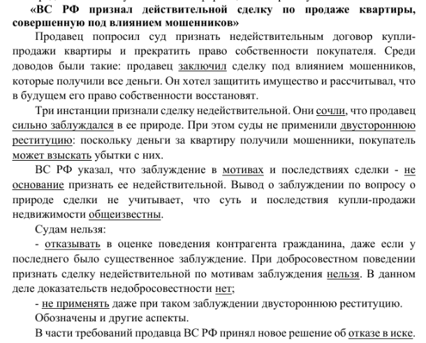 | Информационно-правовая статья "ВС РФ признал действительной сделку по продаже квартиры, совершенную под влиянием мошенников" | скачать |